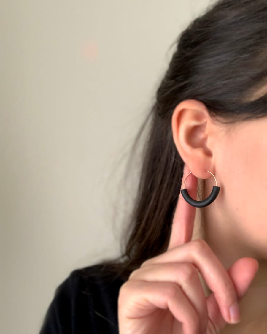 Boucles d’oreilles créoles modernes et minimalistes avec perle tube en argile polymère de couleur noire et créoles hypoallergéniques en Gold-filled 14 carats.