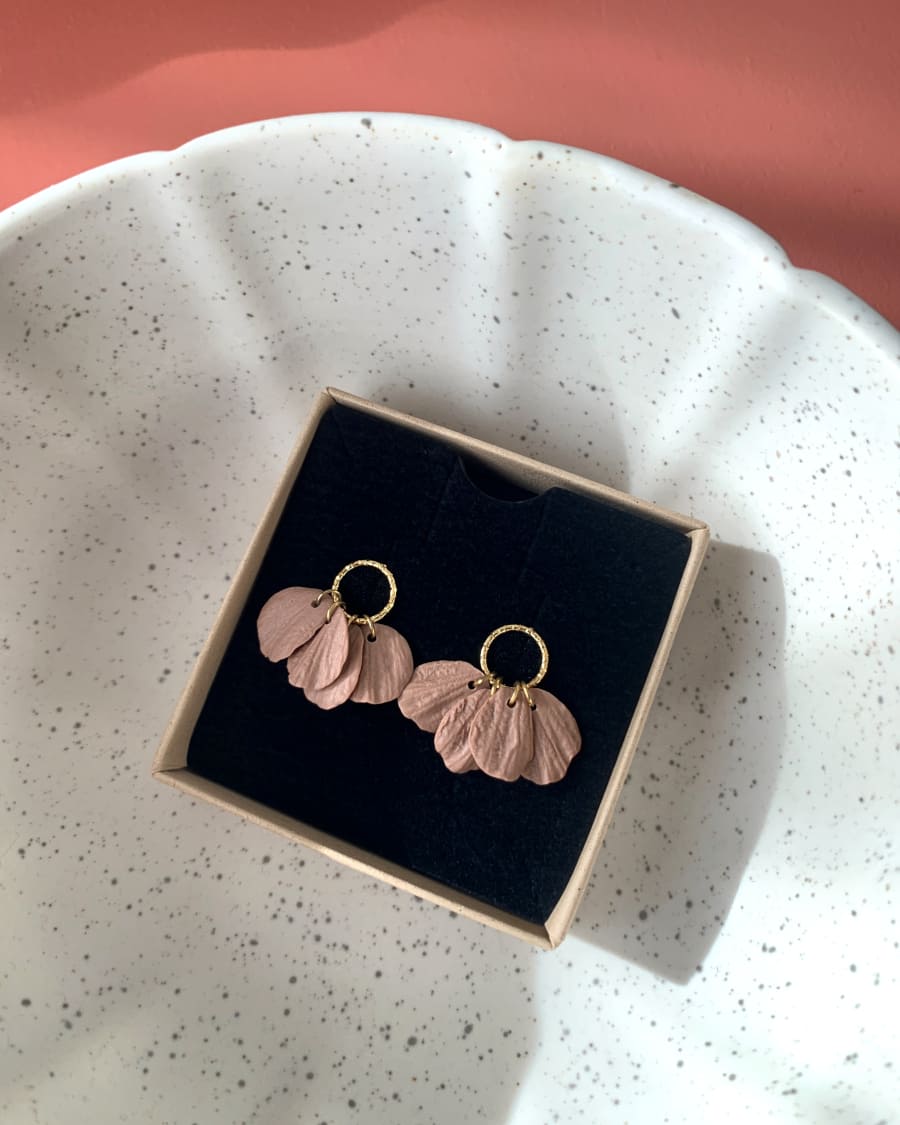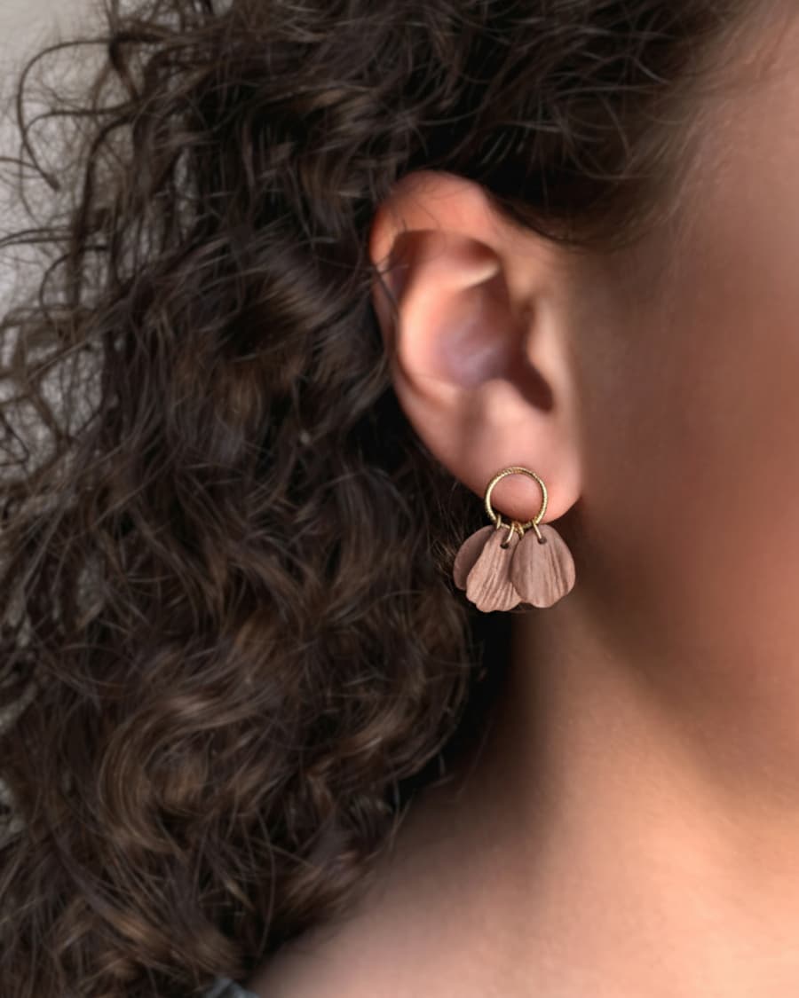 Les boucles d’oreilles Rosae apportent chaleur et caractère grâce à leur brun moka profond. Leur forme de pétales texturés, modelée à la main, offre un relief délicat qui rappelle le froissement naturel des fleurs. Une création artisanale pensée pour celles et ceux qui recherchent un bijou à la fois doux, élégant et affirmé.